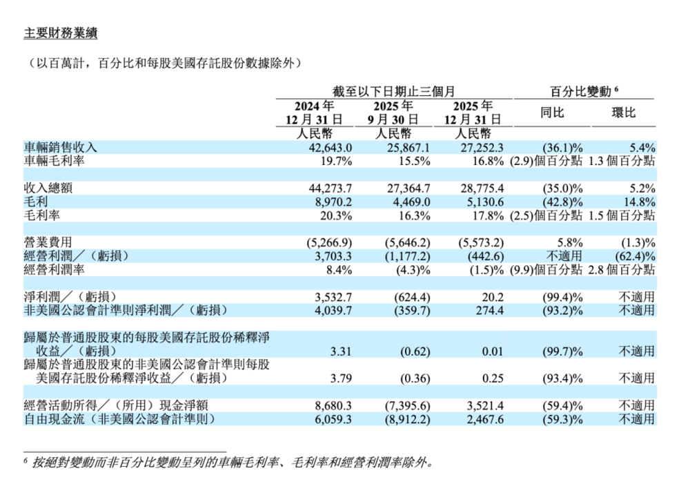 3 月 12 日,梦想汽车发布 2025 年第四季度及全年财报。在上季度录得 6.24 亿元净亏空之后,当季净利终于转正至 0.2 亿元,经调度净利润达 2.74 亿元。车辆毛利率也从上季度的 15.5% 环比回升至 16.8%。