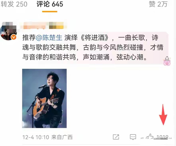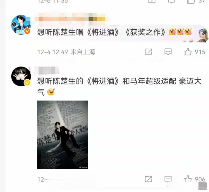 最夸张的是,陈楚生粉丝的刷屏留言,硬是把这条微博顶成了"现代文艺回话现场"——前100条热评里,83条都在安利他的《将进酒》。