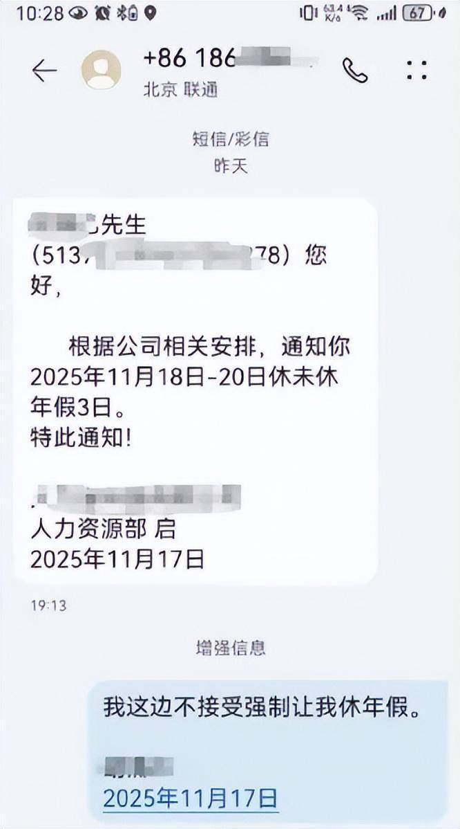 王先生立时复兴,“我这边不接管强制让我休年假。”该复兴信息暴露于“19:22已投递”。王先生说,他没再收到公司的复兴短信。